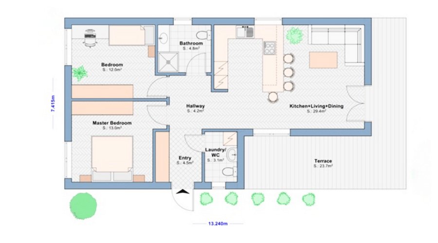 - Cimentación: para terreno firme, losa de canto de 30cm